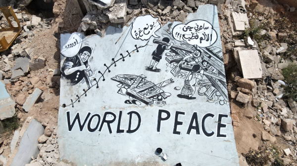 シリア北西部・イドリブ県のがれきの中に描かれた「はだしのゲン」©︎ Muhammad Haj Kadour