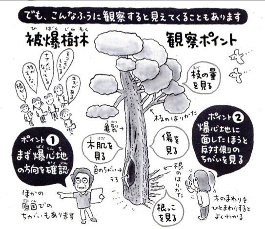 私は被爆樹木について10年以上取材を続けています。今年夏に『新版・広島の木に会いにいく 被爆樹木が見る未来』を出版しました。広島の被爆樹木は、爆心地から半径約2kmの範囲で現在159本が登録されています。観察すると爆心地側は傷を受けていたり、木肌が荒れ、根の張り方や枝の量が少ないなどの症状があり、爆心地の方向に幹が傾いているものがあります。皆さん、広島を訪問される機会がありましたらぜひ被爆樹木を見ていただきたいと思います。